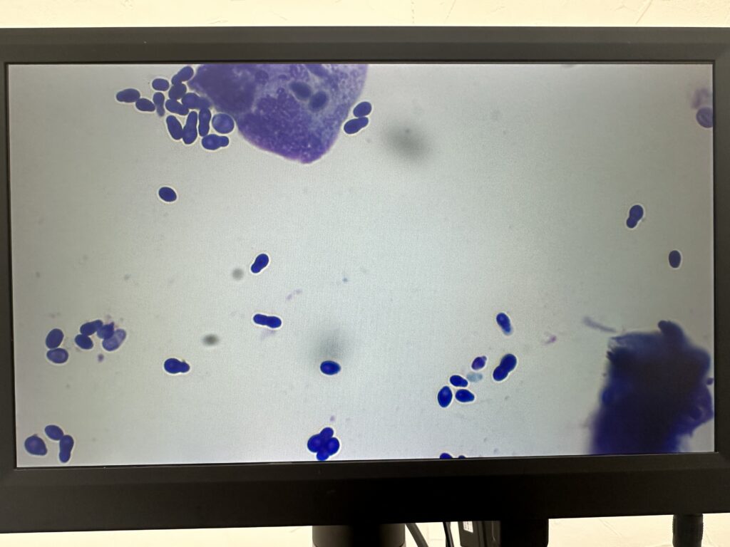 - 顕微鏡検査: 染色液で染めて顕微鏡で覗くと、雪だるまやピーナッツのような特徴的な形をしたマラセチアが多数観察されます。